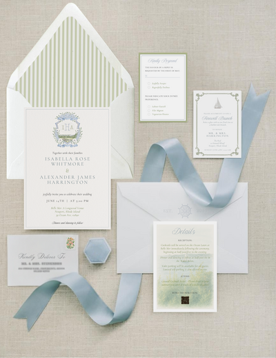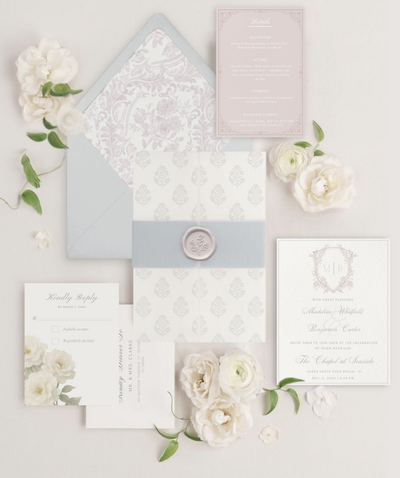 Invitations: complete and flawless! Now relax while we carry your aesthetic through the details—an heirloom keepsake box to preserve your suite, styled flat-lay photography for beautiful imagery, and a coordinating wedding website so every touchpoint feels cohesive and considered.